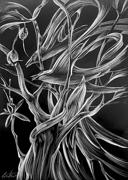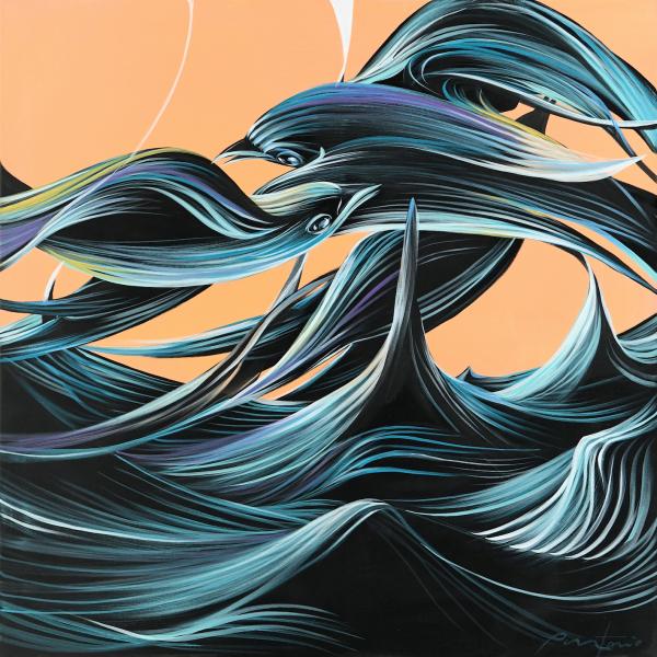 Pantonio est depuis toujours influencé par le fleuve Tage qui traverse le Portugal. Il crée au pinceau des personnages, des animaux fantastiques, des lapins, des poissons, des tortues, toujours en mouvement. On y aperçoit parfois des traits façon cordages qui évoquent la pêche et le monde marin si cher à la tradition portugaise. L’utilisation volontaire de quatre couleurs dominantes, bleu, noir, blanc et rouge, n’est pas sans rappeler le bleu sombre de la mer, le noir des fonds marins et le rouge volcanique du centre de la Terre.